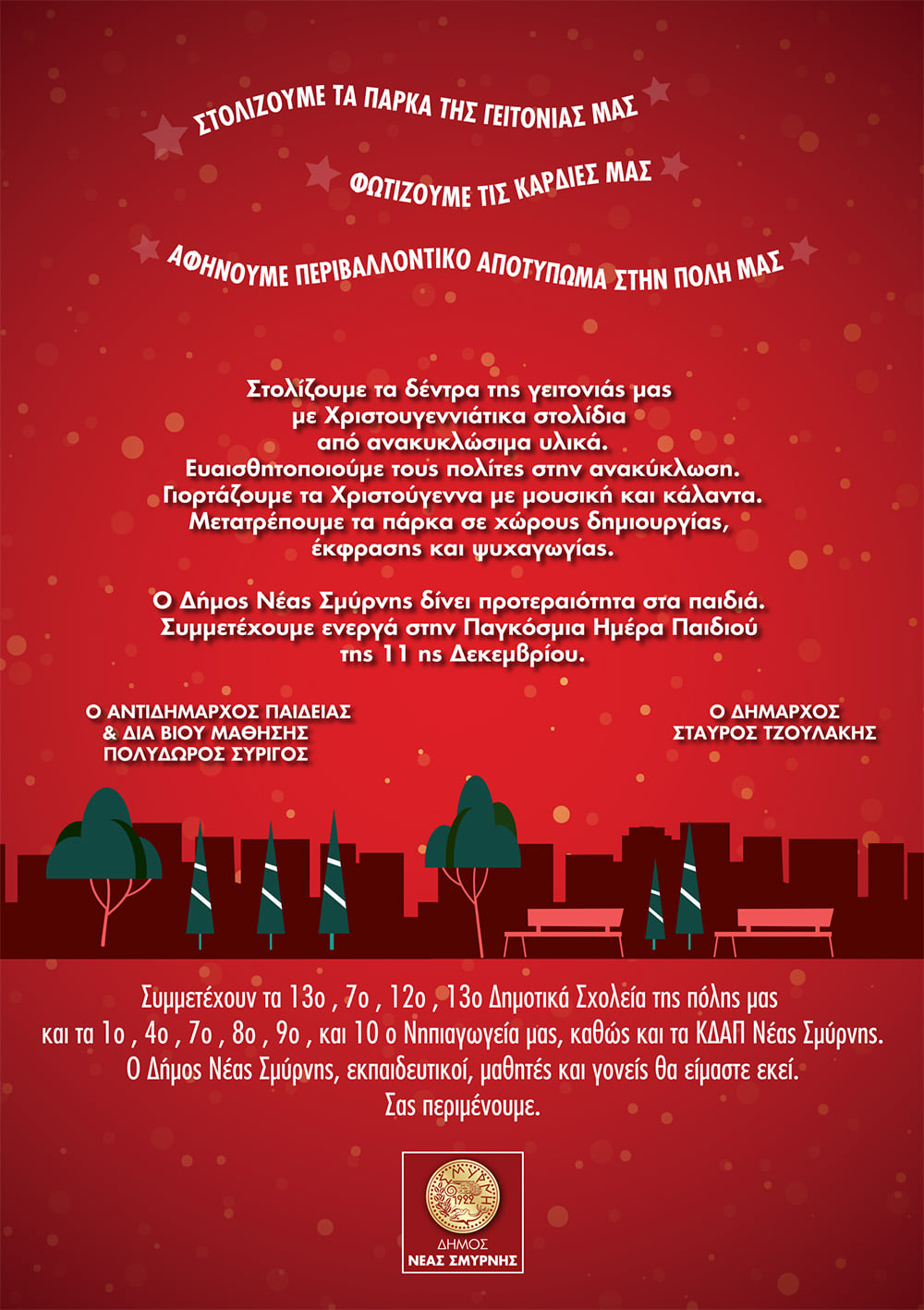 Τα παιδιά θα αναλάβουν να στολίσουν δένδρα σε πάρκα της πόλης μας με ανακυκλώσιμα χριστουγεννιάτικα παιχνίδια.