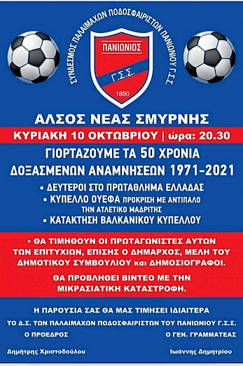 Η ιστορική εκείνη ομάδα του Χάιτα, του Δέδε, του Ιντζόγλου, του μόλις 17 ετών Θωμά Μαύρου και τόσων ακόμη σπουδαίων παικτών θα τιμηθεί λοιπόν την Κυριακή 10 Οκτωβρίου και ώρα 20:30 σε εκδήλωση που θα γίνει στο Άλσος Νέας Σμύρνης, με τον Πρόεδρο και το ΔΣ του συνδέσμου παλαιμάχων ποδοσφαιριστών του Πανιωνίου να καλούν τους φίλους της ομάδας να δώσουν το παρών.