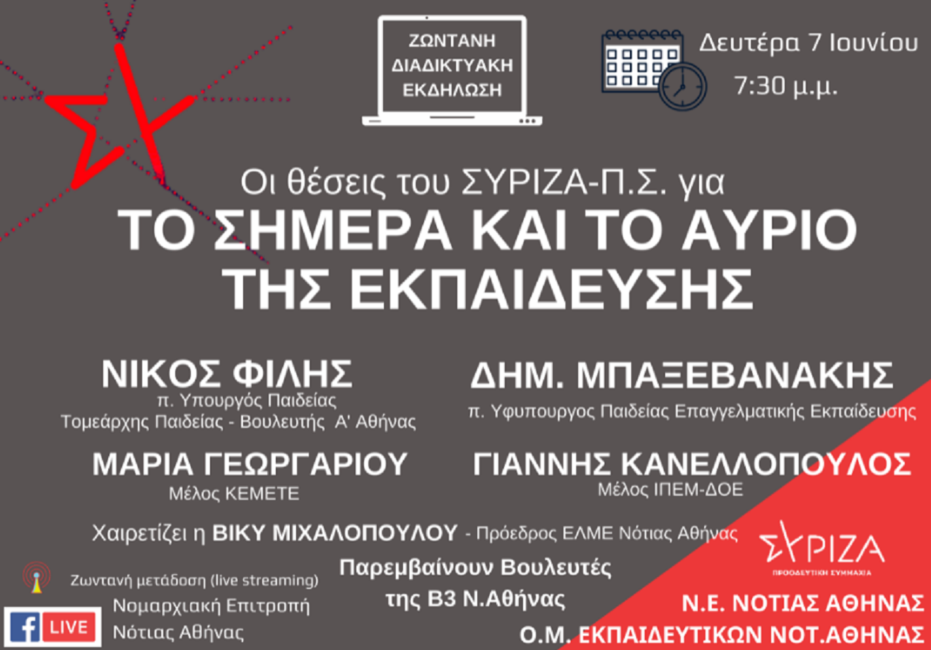 Εκδήλωση ΝΕ Νότιας Αθήνας: ΟΙ ΘΕΣΕΙΣ ΤΟΥ ΣΥΡΙΖΑ – ΠΣ ΓΙΑ ΤΟ ΣΗΜΕΡΑ ΚΑΙ ΤΟ ΑΥΡΙΟ ΣΤΗΝ ΕΚΠΑΙΔΕΥΣΗ