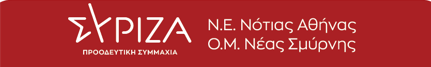 Η Νομαρχιακή Επιτροπή Νότιας Αθήνας και η Οργάνωση Μελών ΣΥΡΙΖΑ-Π.Σ. Νέας Σμύρνης σας προσκαλούν τη Δευτέρα 12 Ιουλίου, στις 19.30, σε ανοιχτή εκδήλωση στην Πλατεία Νέας Σμύρνης, με ομιλητή τον γραμματέα της Κεντρικής Επιτροπής του ΣΥΡΙΖΑ, Δημήτρη Τζανακόπουλο.