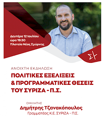 Εκδήλωση ΣΥΡΙΖΑ-ΠΣ στην Πλατεία Νέας Σμύρνης, 12/7 στις 19.30