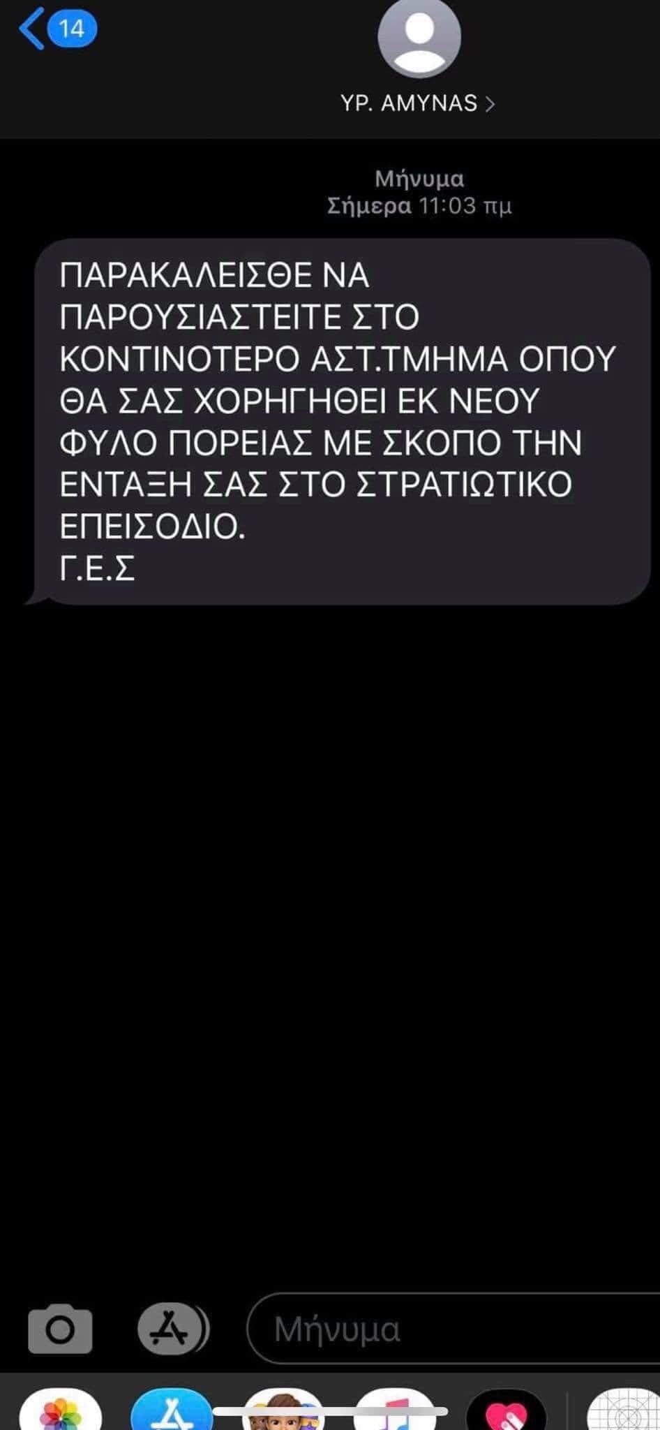 μήνυμα ( sms ),που αποστέλλεται σε κινητά τηλέφωνα, καλώντας τους πολίτες να παρουσιαστούν στο κοντινότερο Αστυνομικό Τμήμα για δήθεν χορήγηση Φύλλου Πορείας από το Στρατό.
