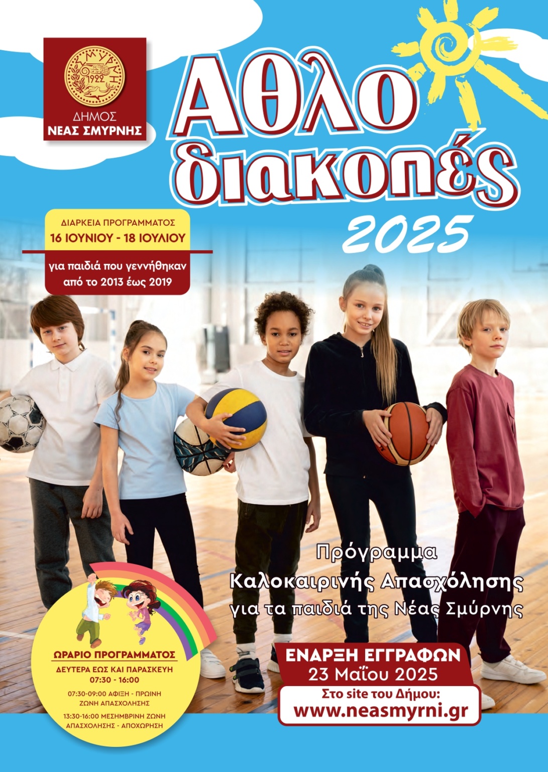 Ξεκινούν αύριο, 23 Μαΐου οι εγγραφές για το πρόγραμμα Αθλοδιακοπές 2025 του Δήμου Νέας Σμύρνης.