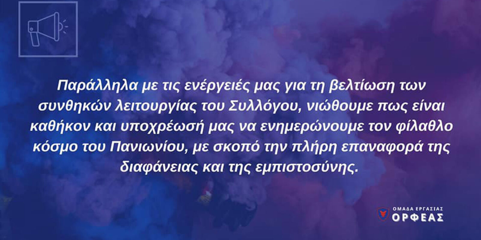 Επιπρόσθετα με τις ενέργειές μας για την βελτίωση των συνθηκών λειτουργίας του Συλλόγου, νιώθουμε πως είναι καθήκον και υποχρέωσή μας να ενημερώνουμε τον φίλαθλο κόσμο του Πανιωνίου, με σκοπό την πλήρη επαναφορά της διαφάνειας και της εμπιστοσύνης.