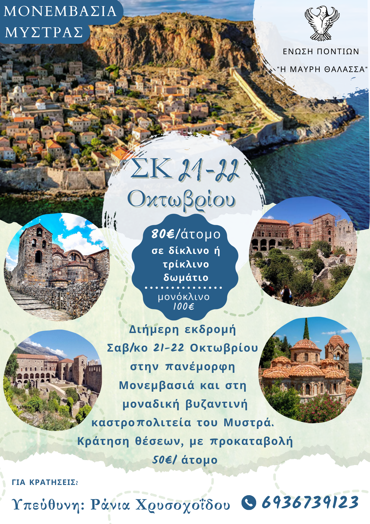 Ενωση Ποντίων 'Η Μαύρη Θάλασσα'' 2ήμερη εκδρομή σε Μυστρά-Μονεμβασία