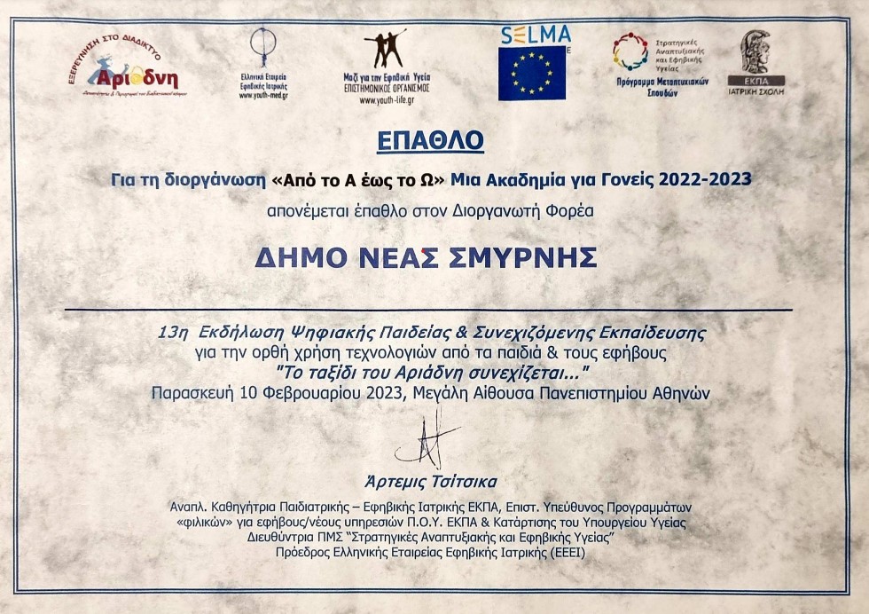 Έπαθλο στο Δήμο Νέας Σμύρνης για την Ακαδημία Γονέων «Εφηβεία από το Α έως το Ω: Μία Ακαδημία για Γονείς»