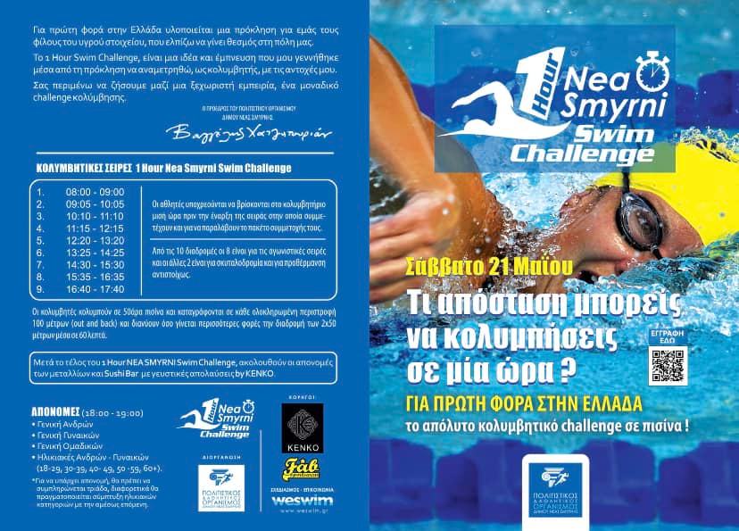 Μια πολύ σπουδαία κολυμβητική πρόκληση έρχεται για πρώτη φορά στην Ελλάδα και μάλιστα λαμβάνει χώρα στη Νέα Σμύρνη! Συγκεκριμένα, ο Πολιτιστικός και Αθλητικός Οργανισμός του Δήμου Νέας Σμύρνης διοργανώνει το One Hour Swim Challenge, με την ελπίδα να γίνει θεσμός στην πόλη.