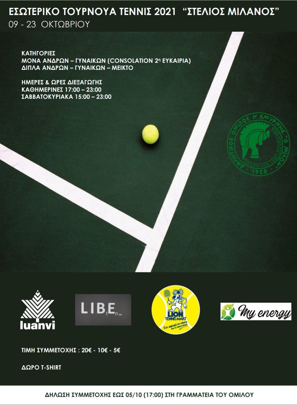 Εσωτερικό τουρνουά τένις στη μνήμη του παλιού αθλητή και μέλους του συλλόγου διοργανώνει ο Μίλωνας από τις 9 έως τις 23 Οκτωβρίου, με όσους επιθυμούν να δηλώσουν συμμετοχή να έχουν τη δυνατότητα να το κάνουν ως την Τρίτη 5 Οκτωβρίου.