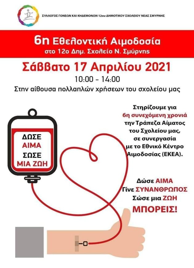 Αγαπητοί γονείς θα θέλαμε να σας υπενθυμίσουμε ότι το Σάββατο 17 Απριλίου 2021 από τις 10.00 έως τις 14.00, θα πραγματοποιηθεί η 6η ΕΘΕΛΟΝΤΙΚΗ ΑΙΜΟΔΟΣΙΑ του 12ου, μια δράση του Συλλόγου Γονέων & Κηδεμόνων σε συνεργασία με το Εθνικό Κέντρο Αιμοδοσίας (ΕΚΕΑ).