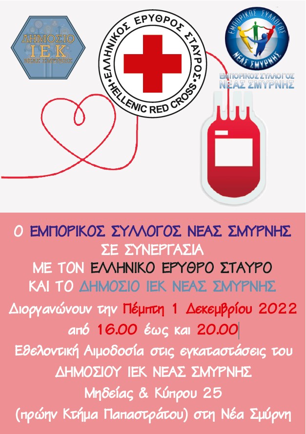 Διοργανώνουν την Πέμπτη 1 Δεκεμβρίου 2022 από 16.00 έως και 20.00 Εθελοντική Αιμοδοσία στις εγκαταστάσεις του ΔΗΜΟΣΙΟΥ ΙΕΚ ΝΕΑΣ ΣΜΥΡΝΗΣ