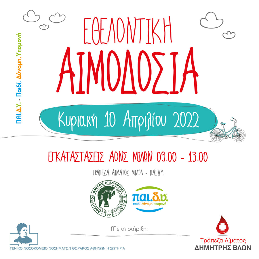 Ο ΑΟΝΣ Μίλων και το σωματείο ΠΑΙ.Δ.Υ., (Παιδί, Δύναμη, Υπομονή), σας προσκαλούν την Κυριακή 10 Απριλίου από τις 09:00 μέχρι τις 13:00 στην Εθελοντική Αιμοδοσία που θα πραγματοποιηθεί στις εγκαταστάσεις του συλλόγου.