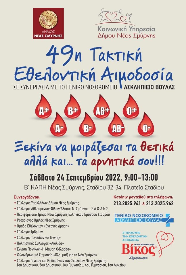Σάββατο 24 Σεπτεμβρίου 2022, 09:00-13:00, Β ΚΑΠΗ Νεας Σμύρνης Σταδίου 32-34 Πλατεία Σταδίου