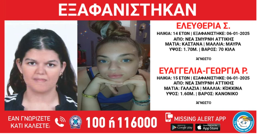 Σύμφωνα με την ενημέρωση από το Χαμόγελο του Παιδιού, τα δύο κορίτσια αγνοούνται από το βράδυ των Θεοφανίων και προχώρησε στην δημοσιοποίηση των στοιχείων τους μόλις ενημερώθηκε για την εξαφάνισή τους, καθώς ενδέχεται η ζωή τους να βρίσκεται σε κίνδυνο.
