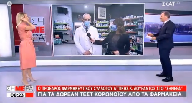 «Παραποιείτε τις εκφράσεις μου, δεν είπα ποτέ κάτι τέτοιο. Θα σας απαντήσω αν και δεν είχα διάθεση να συζητήσω με τον ΣΚΑΪ, σχετικά με τις επιφυλάξεις του για τα self τεστ. Προσπαθείτε να βάλετε λόγια σε μένα που... Σηκωθείτε και φύγετε από τον χώρο που σας φιλοξενεί αυτή τη στιγμή, ντροπή σας, φύγετε από το φαρμακείο μου. Αυτά που κάνατε το βράδυ, ντροπή σας, ντροπή σας, ντροπή σας. Άντε γεια σας».