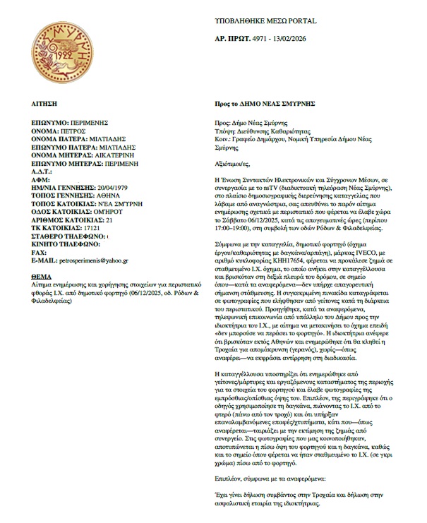 Η πολίτισσα δήλωσε το συμβάν στην Τροχαία και την ασφαλιστική της, η οποία απέστειλε τρία αιτήματα προς τον Δήμο χωρίς ανταπόκριση—παρά τη λήξη προθεσμιών. Email της πρωτοκολλήθηκε στις 27/1/2026, με απάντηση από Γραφείο Δημάρχου (2/2/2026) που ζητούσε αποδείξεις. Τηλεφωνικά, υπάλληλος Καθαριότητας ισχυρίστηκε ότι το Ι.Χ. ήταν ήδη κατεστραμμένο, αλλά αρνήθηκε γραπτή επιβεβαίωση.