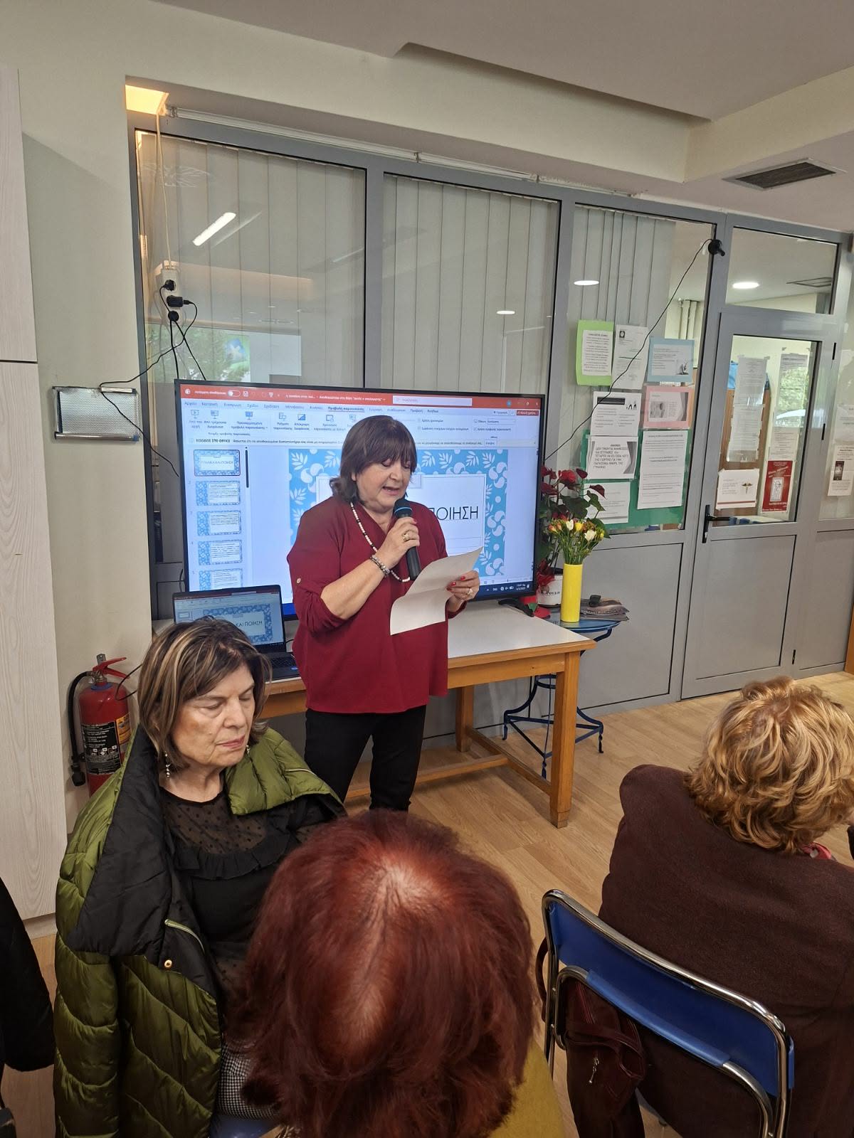 Τα μέλη του ΚΑΠΗ, σε ομιλίες τους, τόνισαν ότι «η Γυναίκα και η Ποίηση είναι δύο δυνάμεις δημιουργικές, αμφίδρομες, οι οποίες μας φέρνουν κάτι καινούργιο, κάτι νέο, μια νέα οντότητα σχεδόν εκ του μηδενός». Η εκδήλωση περιλάμβανε παρουσιάσεις ποιητριών, με γυναίκες να μιλούν μπροστά σε οθόνες και να κρατούν μικρόφωνα, ενώ άλλες συμμετείχαν σε συζητήσεις. Η Αθανασία Κιοβρέκη, Κοινωνική Λειτουργός του Α' ΚΑΠΗ, συντόνισε την εκδήλωση, συμβάλλοντας στην οργάνωση δραστηριοτήτων που προάγουν την κοινωνική ένταξη ηλικιωμένων.
