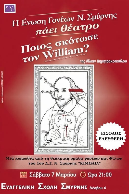 Η Ένωση Γονέων Νέας Σμύρνης οργανώνει μια απολαυστική βραδιά με την κωμωδία «Ποιος σκότωσε τον Ουίλιαμ;». Η παράσταση θα δοθεί αύριο, Σάββατο 7 Μαρτίου 2026, στις 21:00, στην Ευαγγελική Σχολή Σμύρνης, με ελεύθερη είσοδο για όλους.