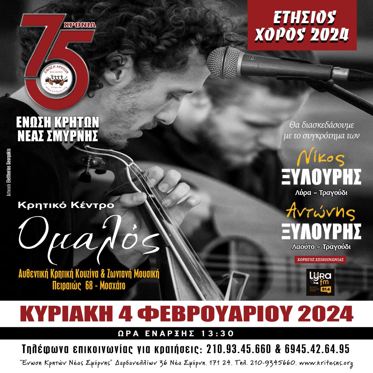 Η Ένωση Κρητών Νέας Σμύρνης σας προσκαλεί στον ετήσιο χορό της, την Κυριακή 4 Φεβρουαρίου 2024 και ώρα 13:30πμ., στο κρητικό κέντρο "Ομαλός".