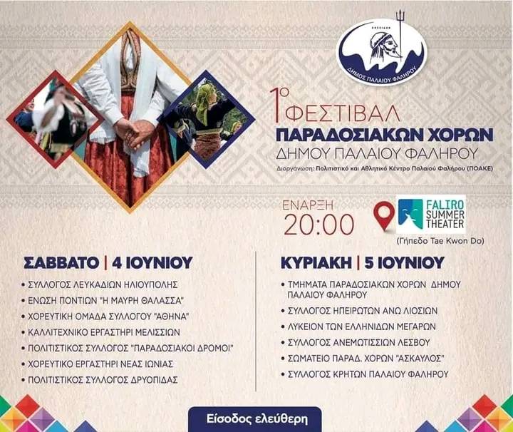 Αυτό το Σάββατο 4/6, σας προσκαλούμε στο 1ο Φεστιβάλ παραδοσιακών χορών του δήμου Π. Φαλήρου, στο Faliro Summer Theatre (δίπλα στο Tae kwon do) στο οποίο συμμετέχουμε χάρις στην πρόσκληση του Πολιτιστικό Αθλητικό Κέντρο Δήμου Παλαιού Φαλήρου. και τη φίλη Ειρήνη Μαγουλά. Μας συνοδεύουν οι υπέροχοι μουσικοί, στη λύρα ο Γιαννης Φωτιαδης και στο νταούλι ο Φιλιππος Πουρπουτιδης. Ώρα έναρξης 8 μ. μ., είσοδος ελεύθερη