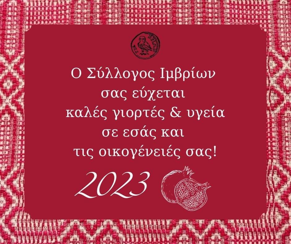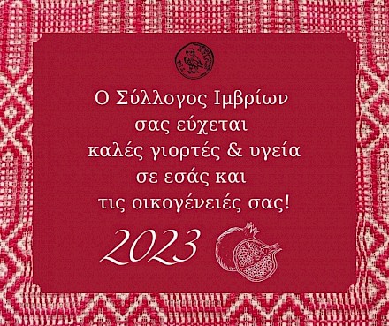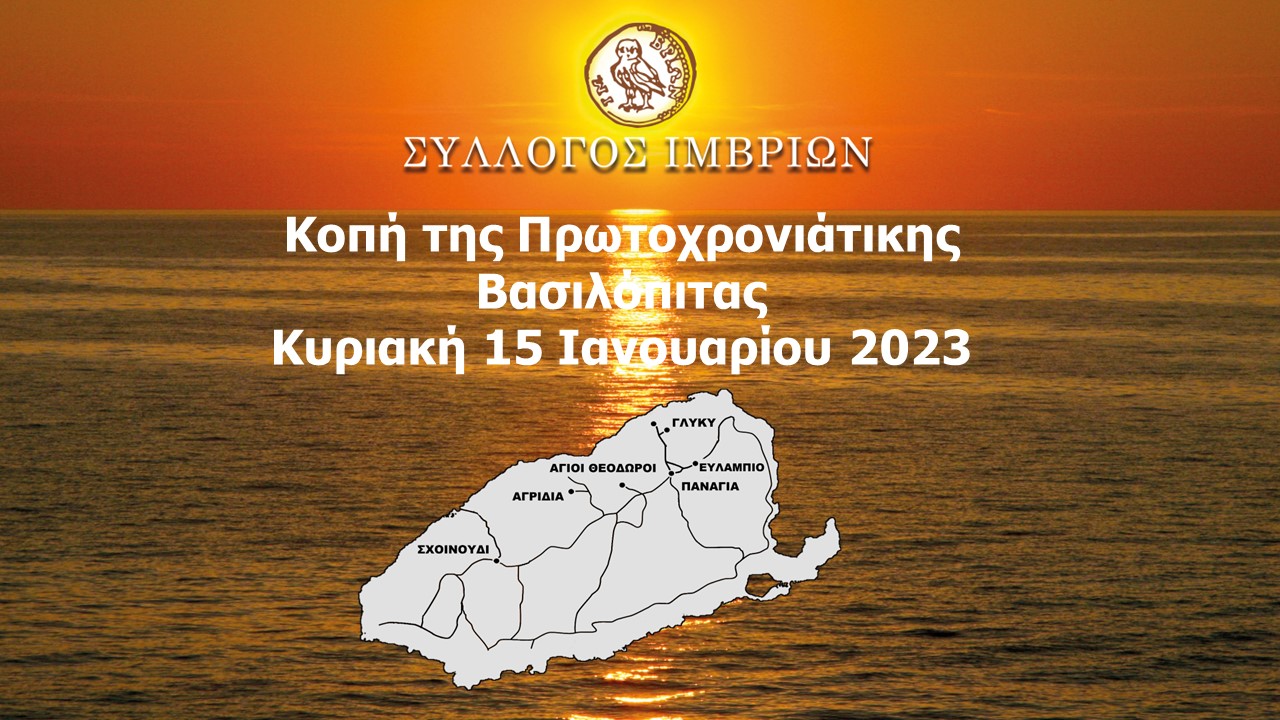 Την Κυριακή 15 Ιανουαρίου 2023, παρουσία πλήθους συμπατριωτών και φίλων της Ίμβρου και με την ευλογία του Θεοφιλέστατου Επισκόπου Ωρέων Φιλόθεου ως εκπροσώπου του Οικουμενικού Πατριάρχη και του Πατέρα Διονύσιου ως εκπροσώπου του Μητροπολίτη Ν. Σμύρνης, πραγματοποιήθηκε για πρώτη φορά μετά την άρση των περιοριστικών μέτρων λόγω της πανδημίας η καθιερωμένη τελετή κοπής της πρωτοχρονιάτικης βασιλόπιτας του Συλλόγου Ιμβρίων. Στη συνέχεια της ανάρτησης αυτής, μπορείτε να διαβάσετε το σχετικό Δελτίο Τύπου, να παρακολουθήσετε όλη την εκδήλωση και τα βίντεο που προβλήθηκαν καθώς και στιγμιότυπα από την εκδήλωση.