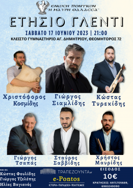 Σας προσκαλούμε στο ετήσιο γλέντι του συλλόγου μας το Σάββατο 17.06 και ώρα 21.00 στο κλειστό γυμναστήριο Αγ. Δημητρίου, Θεομήτορος 72. Αγαπημένοι μουσικοί έρχονται από την Μακεδονία να μας μεταφέρουν τον παλμό του ποντιακού γλεντιού, ενώ θα έχουμε και υπέροχο λαϊκό πρόγραμμα.