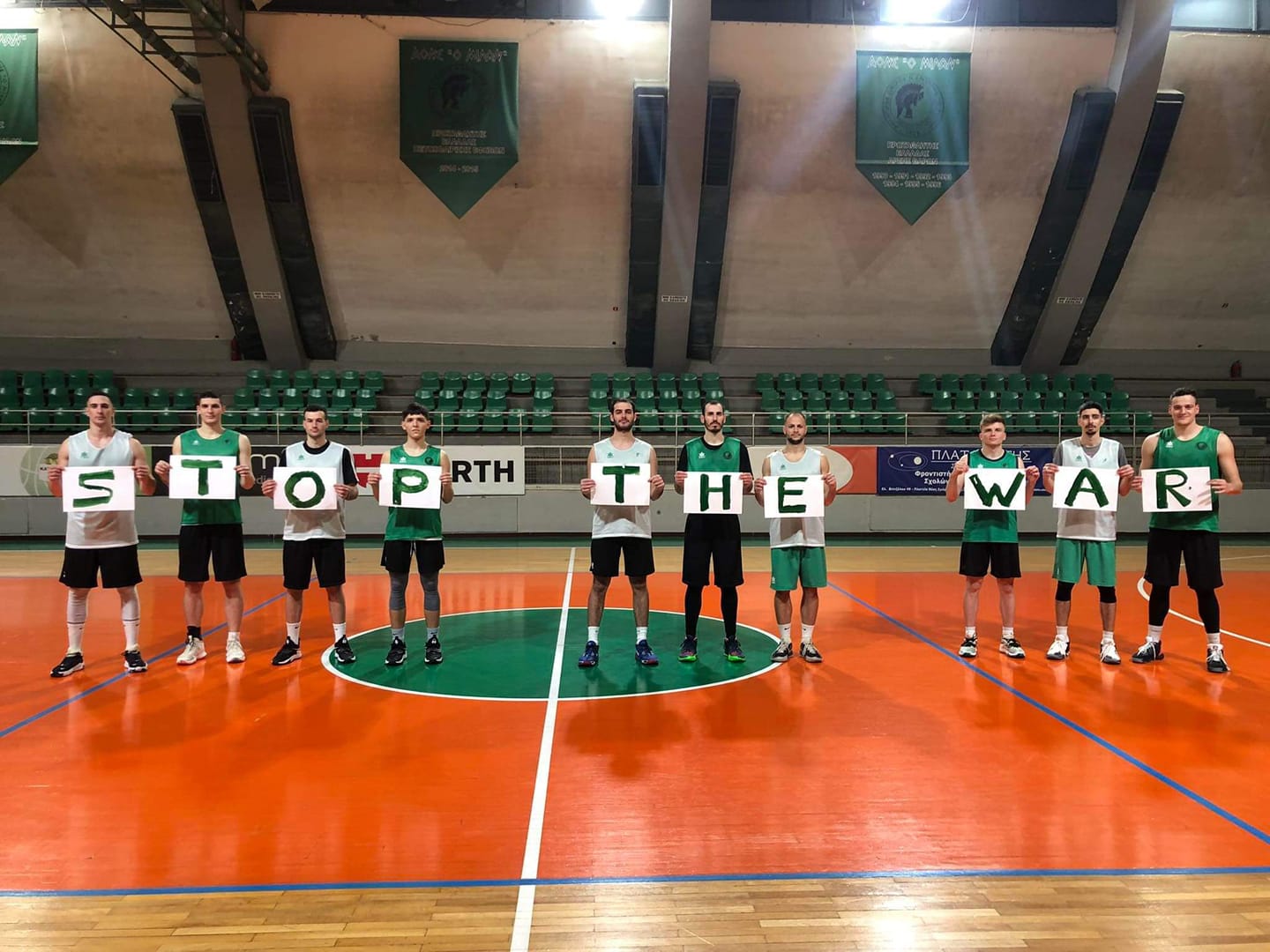 Όπως μπορείτε να δείτε στην παρακάτω φωτογραφία, οι αθλητές της ομάδας μπάσκετ του Μίλωνα στέλνουν το δικό τους μήνυμα κατά του πολέμου, με την ευχή σύντομα ο εφιάλτης να τελειώσει.