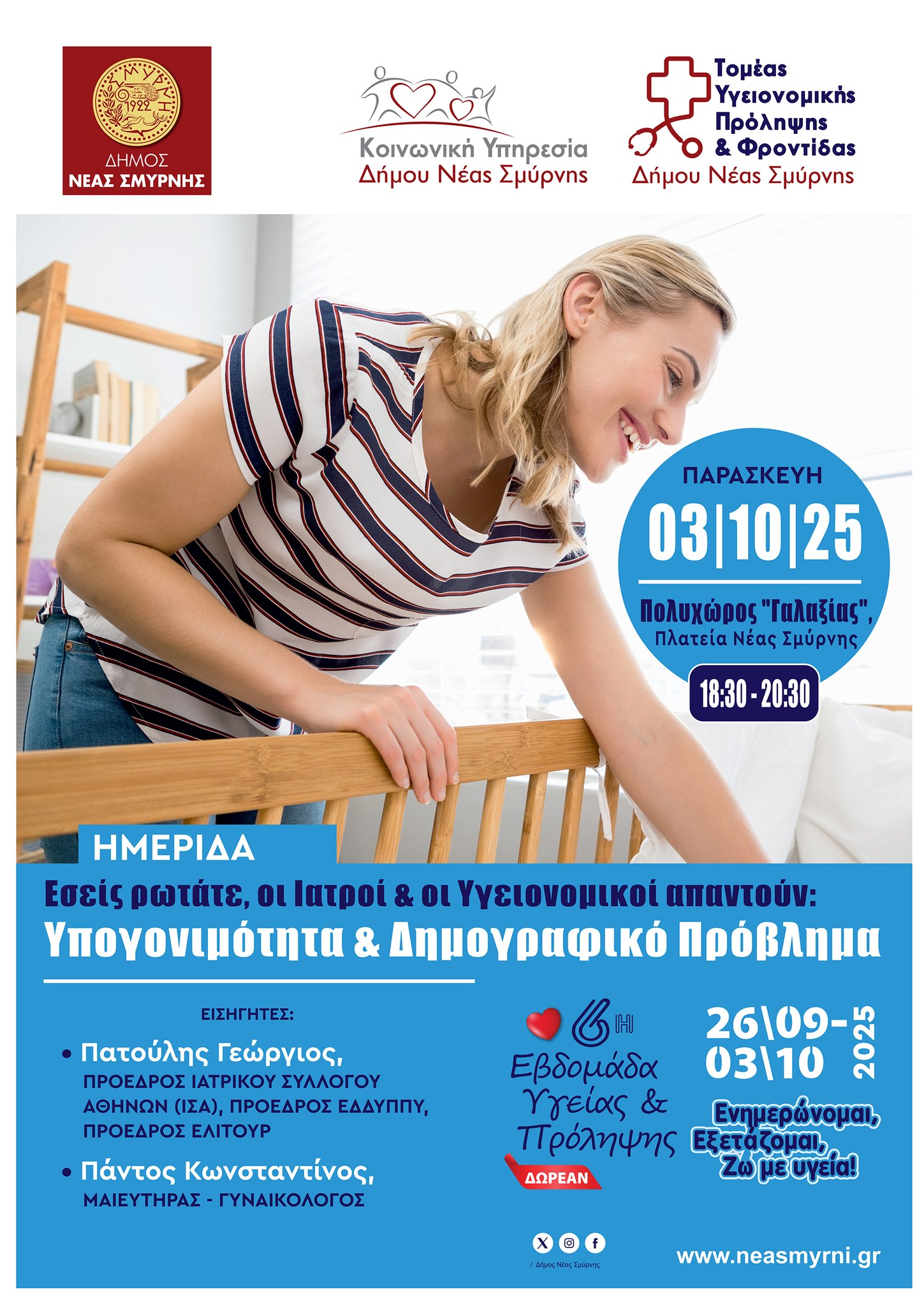 Ημερίδα με θέμα «Υπογονιμότητα & Δημογραφικό Πρόβλημα» διοργανώνεται την Παρασκευή 3 Οκτωβρίου στο πλαίσιο της 6ης «Εβδομάδας Υγείας & Πρόληψης» που διοργανώνει η Κοινωνική Υπηρεσία του Δήμου Νέας Σμύρνης.