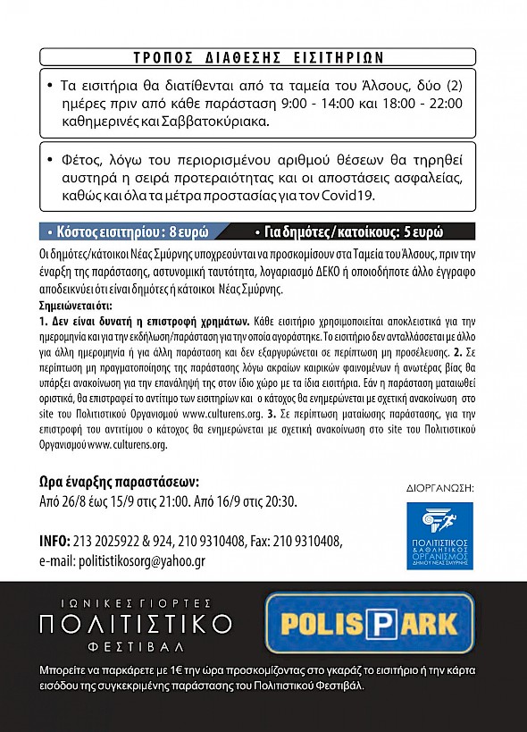 Τα εισιτήρια διατίθενται από του ταμείο του Άλσους δύο (2) ημέρες πριν από κάθε παράσταση μεταξύ 9:00 έως 14:00 και 18:00 έως 22:00 καθημερινές και σαββατοκύριακα. Φέτος, λόγω του περιορισμένου αριθμού θέσεων, θα τηρηθούν αυστηρά οι αποστάσεις ασφαλείας, τα όποια άλλα μέτρα προστασίας χρειαστούν για τον Covid-19 και φυσικά η σειρά προτεραιότητας.