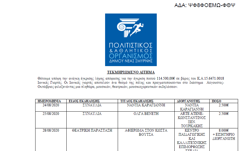 Θα ακολουθήσουν αρκετές ακόμη αποφάσεις και εντάλματα πληρωμής που ανεβάζουν σημαντικά το συνολικό εγκεκριμένο κόστος των Ιωνικών Γιορτών 2020 και εγκρίθηκαν προηγούμενες ημερομηνίες ή θα εγκριθούν σε απόμενες ,όπως αυτέ έχουν αναρτηθεί η θα αναρτούνται στην Διαύγεια.