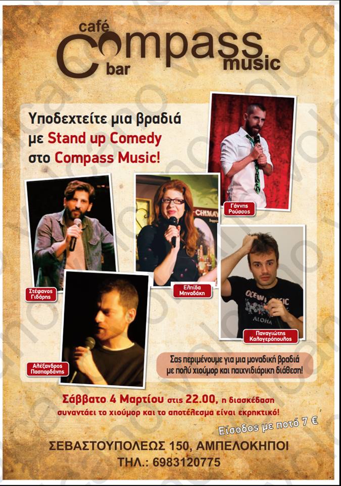 Τώρα το αγαπημένο σας στέκι Compass Music υποδέχεται 5 κωμικούς και υπόσχεται μια βραδιά γεμάτη γέλιο!
