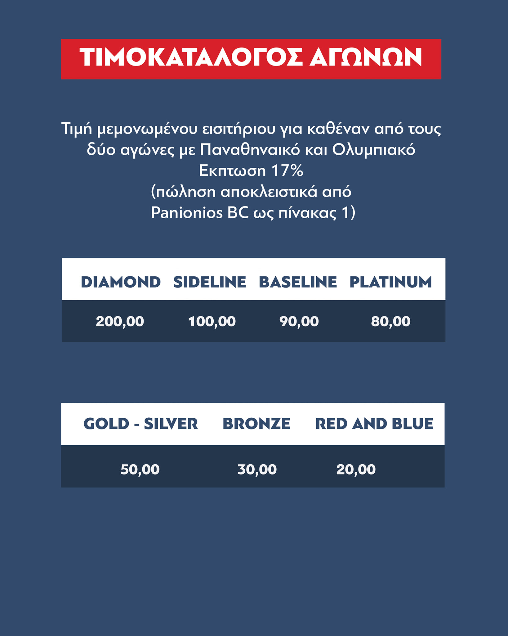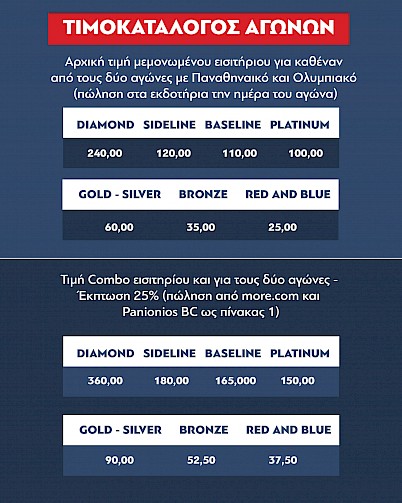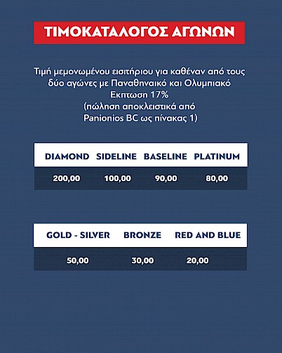 Στην προπώληση εισιτηρίων από Παρασκευή 29/11 έως και την προηγούμενη ημέρα των αγώνων ισχύει έκπτωση 17% επί των αρχικών τιμών.