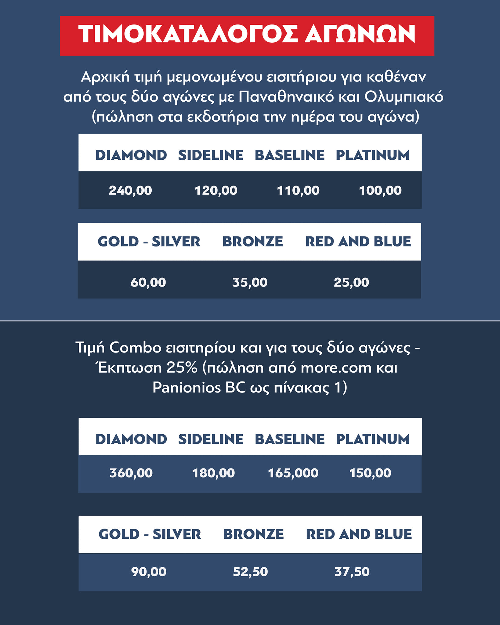 Για πρώτη φορά φέτος, παρουσιάζουμε το combo εισιτήριο το οποίο αφορά είσοδο ΚΑΙ ΣΤΟΥΣ ΔΥΟ ΑΓΩΝΕΣ με συνολική έκπτωση 25% επί των αρχικών τιμών των δύο αγώνων. ΠΡΟΣΟΧΗ: Με το ίδιο εισιτήριο- barcode έχετε δικαίωμα εισόδου ΚΑΙ ΣΤΟΥΣ ΔΥΟ ΑΓΩΝΕΣ.