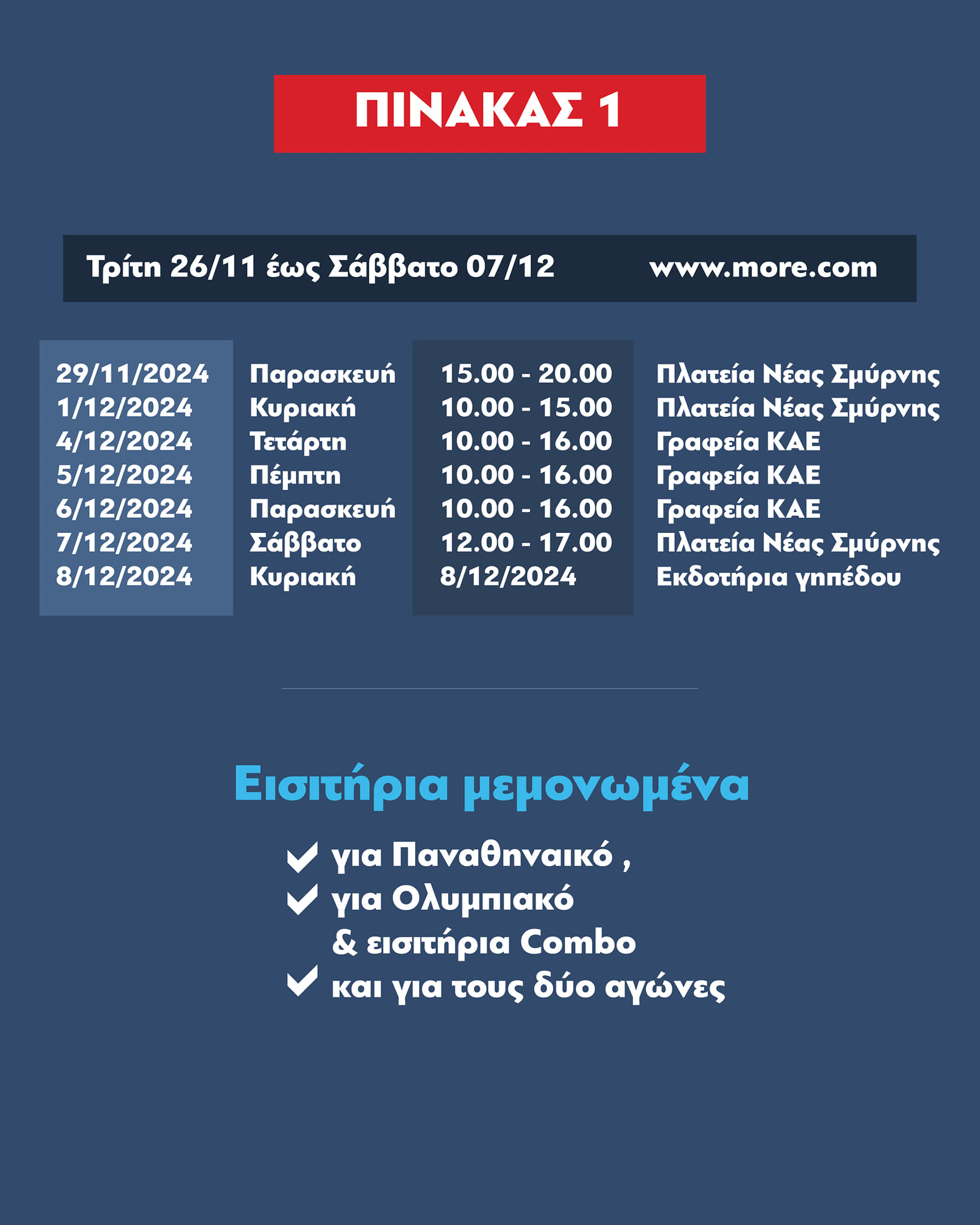 Μεμονωμένα εισιτήρια και για τους δύο αγώνες θα διατίθενται από την Παρασκευή 29/11 (Black Friday) ΑΠΟΚΛΕΙΣΤΙΚΑ από τα σημεία πώλησης, τις ημέρες και τις ώρες, που αναφέρονται στον πίνακα 1. (όχι από την πλατφόρμα της more.com).