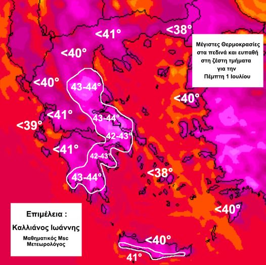 Στη φωτογραφία που σας έχω επισυνάψει, μπορεί εύκολα να καταστεί σαφές ότι η Πέμπτη θα είναι μια πολύ δύσκολη μέρα για τις περισσότερες περιοχές της χώρας. Όμως θα επιμείνω για κάποια συγκεκριμένα τμήματα της επικράτειας όπου εκεί ο υδράργυρος θα ξεπεράσει και τους 42°C και πιθανότατα να φτάσει τους 43°C και ίσως πολύ τοπικά και τους 44°C. Άρα την Πέμπτη θα τη θυμόμαστε για καιρό λόγω και της αυξημένης δυσφορίας και τις βραδινές ώρες ειδικά στις μεγαλουπόλεις.