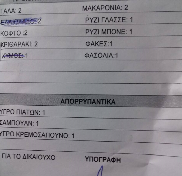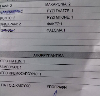 Η καταγγελία όπως μας ήρθε από τον Νεοσμυρνιώτη κ.Νίκο Παπαγεωργίου μαζί με μια φωτογραφία της λίστας των λιγοστών προϊόντων από το Κοινωνικό Παντοπωλείο του Δήμου Νέας Σμύρνης