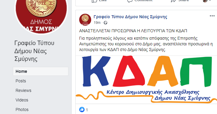 Εκπληξη προκαλεί η προ ολίγου ξαφνική ανακοίνωση του Δήμου Νέας Σμύρνης για προσωρινή αναστολή Λειτουργία των ΚΔΑΠ του Δήμο για προληπτικούς λόγους, κατόπιν απόφασης της Επιτροπής Αντιμετώπισης του κορονοιού.