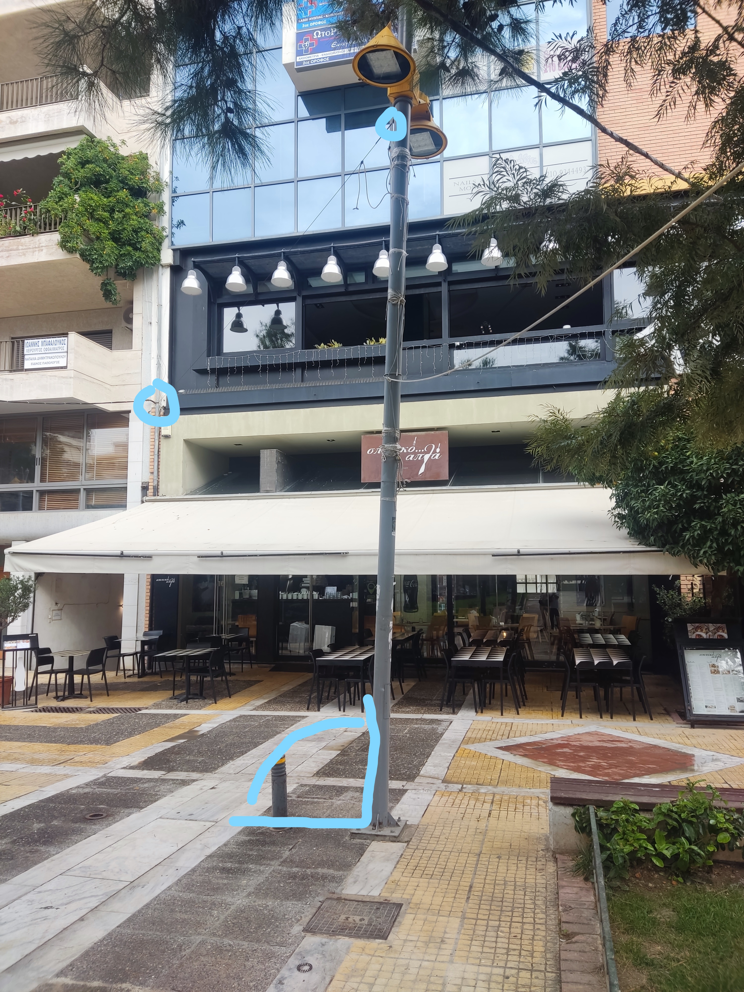 Στην ακριβώς επόμενη γωνία, η κολώνα ηλεκτροφωτισμού έχει γύρει και αντί να την αντικαταστήσουν την έχουν στερέωσει με συρματόσχοινο στην απέναντι πολυκατοικία