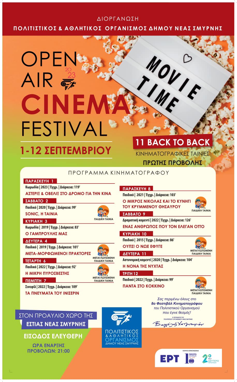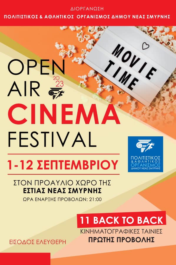 Κινηματογραφικές ταινίες πρώτης προβολής από τον Πολιτιστικό και Αθλητικό Οργανισμό από 1η-12 Σεπτεμβρίου στο Open Air Cinema Festival στον προαύλειο χώρο της Εστίας Νέας Σμύρνης.