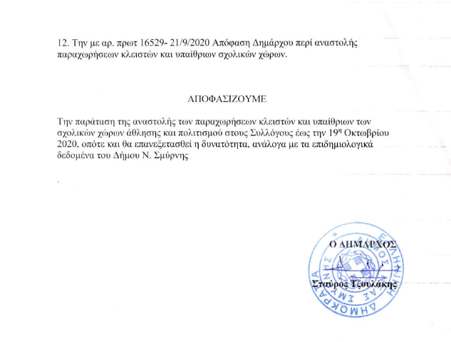 Συνέχεια στην απόφαση για την μη χρήση από τα αθλητικά και πολιτιστικά σωματεία των ανοικτών και κλειστών σχολικών χώρων.