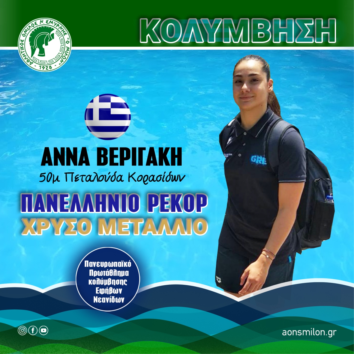 Σπουδαία επιτυχία για τη νεαρή αθλήτρια του Μίλωνα Άννα Βεριγάκη, η οποία κατέκτησε το χρυσό μετάλλιο στα 50 μ. πεταλούδα Κορασίδων στα πλαίσια του Πανευρωπαϊκού Πρωταθλήματος, σημειώνοντας παράλληλα και πανελλήνιο ρεκόρ!