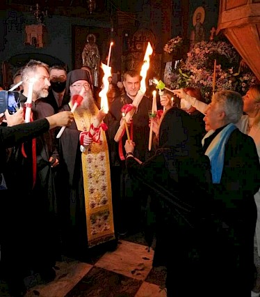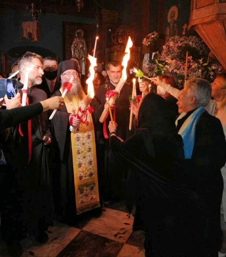 Ακολούθησε σύντομη δέηση στον Ναό και μετά μεταλαμπαδεύτηκε το Άγιο Φως στους παρευρισκομένους. Αξίζει να αναφερθεί ότι στο τέλος μας εξιστόρησε την φετινή του εμπειρία κατά την αφή του Αγίου Φωτός στον Πανάγιο Τάφο των Ιεροσολύμων, όπου από την θέση στην οποία βρισκόταν πέρασε μια φωτεινή λάμψη μπροστά από τον μεγαλειώδη πολυέλαιο του Ναού, «σαν φωτιά» κατά τα λεγόμενα του, η οποία έγινε αντιληπτή και καταγράφτηκε από πολλές κάμερες.