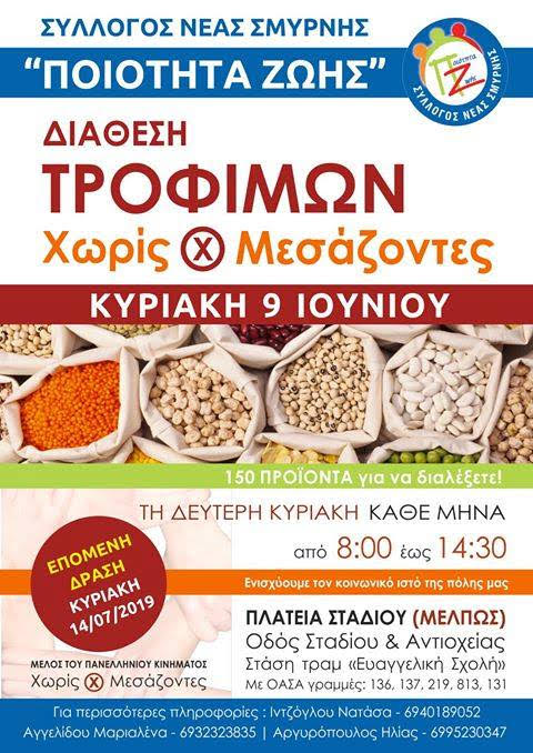 ΚΥΡΙΑΚΗ 9 ΙΟΥΝΙΟΥ, ΔΙΑΘΕΣΗ ΤΡΟΦΙΜΩΝ ΧΩΡΙΣ ΜΕΣΑΖΟΝΤΕΣ ΤΟΥ ΣΥΛΛΟΓΟΥ Ν.ΣΜΥΡΝΗΣ 'ΠΟΙΟΤΗΤΑ ΖΩΗΣ'