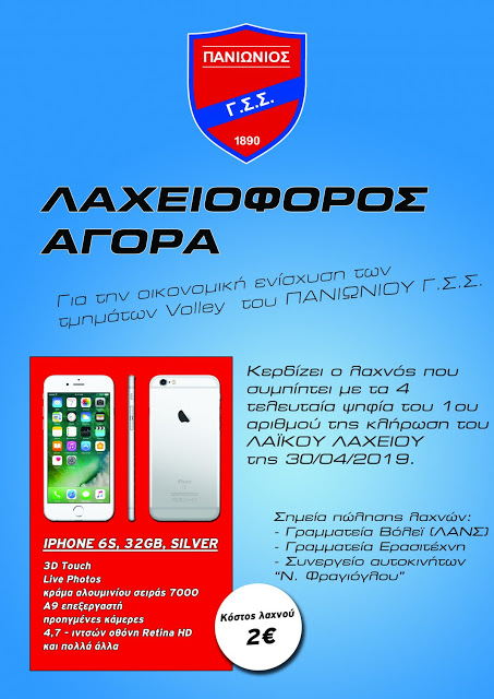 Λαχειοφόρο αγορά οργανώνουν τα τμήματα βόλεϊ του Πανιωνίου, με σκοπό την οικονομική ενίσχυσή τους. Ο λαχνός που θα κερδίσει θα είναι αυτός που θα συμπίπτει με τα 4 τελευταία ψηφία του πρώτου αριθμού της κλήρωσης του ΛΑΪΚΟΥ ΛΑΧΕΙΟΥ στις 30 Απριλίου 2019.