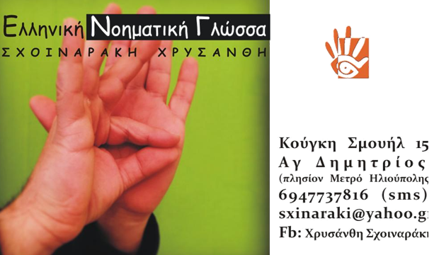 Κλείνοντας τη συνέντευξη, μας προσκάλεσαν ανοικτά να επικοινωνήσουμε μαζί τους και να επισκεφτούμε το χώρο τους για να τους γνωρίσουμε από κοντά. Η σχολή της Σχοιναράκη Χρυσάνθης βρίσκεται στον Άγιο Δημήτριο, Κούγκη Σαμουήλ 15, (πλησίον Μετρό Ηλιούπολη) και είναι ανοικτή σε όλους!! Σεβόμενοι την οικονομική κρίση και την ατομική προσωπικότητα του καθενός, προσφέρουν ευέλικτα και οικονομικά τμήματα εκμάθησης της νοηματικής γλώσσας, ενώ προετοιμάζουν και για εξετάσεις επάρκειας. Η νοηματική γλώσσα είναι ένας εξαιρετικά πλούσια και πολυδιάστατη, προσιτή σε όλους, όπως απέδειξαν η Χρυσάνθη και ο Βασίλης μέσα από αυτή τη συζήτηση!