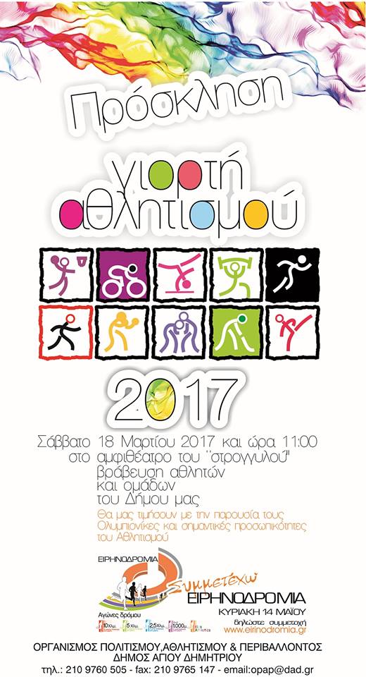 Ο Δήμος Αγίου Δημητρίου και ο Οργανισμός Πολιτισμού, Αθλητισμού και Περιβάλλοντος στο πλαίσιο της Ειρηνοδρομίας που θα πραγματοποιηθεί στις 14 Μαΐου πραγματοποίησαν εκδήλωση με τίτλο «Γιορτή Αθλητισμού» κατά τη διάρκεια της οποίας πραγματοποιήθηκαν βραβεύσεις αθλητών και ομάδων του δήμου, αλλά και ολυμπιονικών για την προσφορά τους στον αθλητισμό.