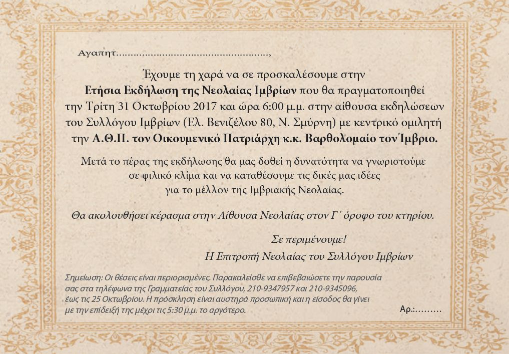 Σην εκδήλωση θα τιμήσει με την υψηλή παρουσία Σου η Α.Θ.Π. ο Οικουμενικός Πατριάρχης κ.κ. Βαρθολομαίος ο Ίμβριος, ο οποίος θα απευθύνει το δικό του μήνυμα προς τους νέους της Ίμβρου.