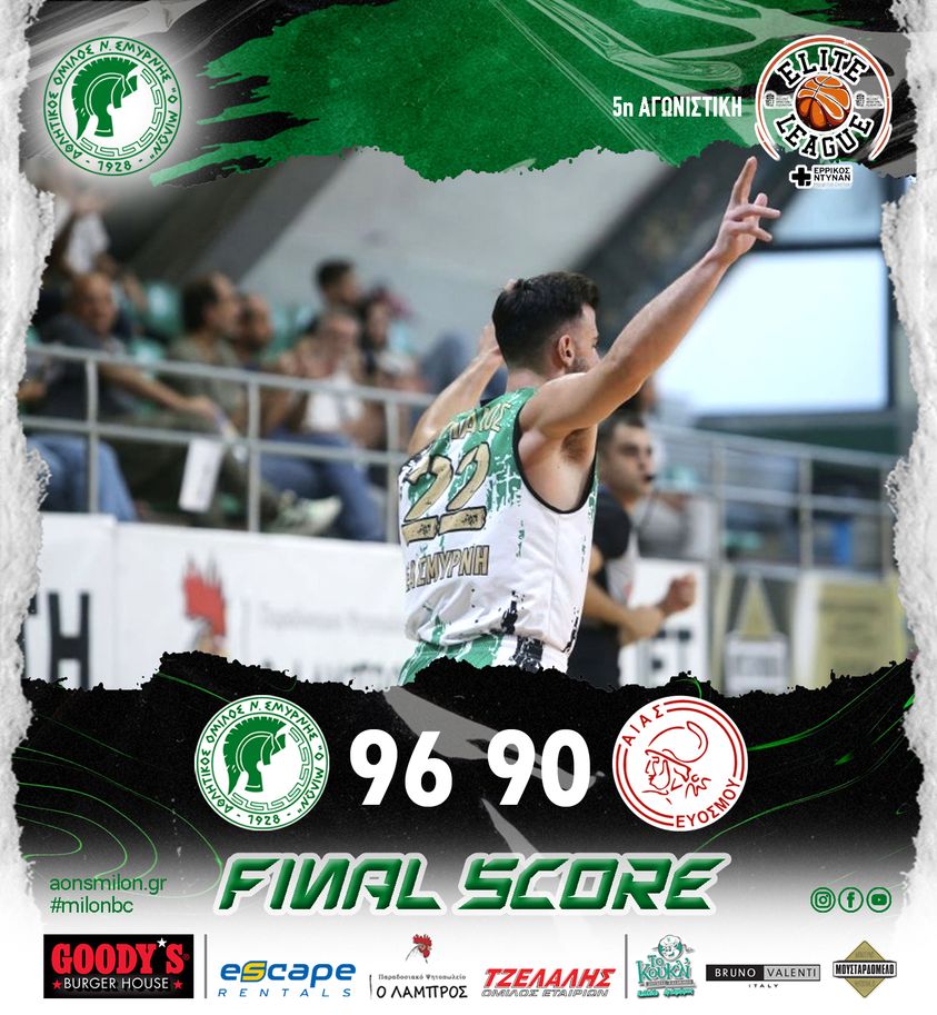 Νικηφόρα συνέχισε την πορεία της η ομάδα μπάσκετ του Μίλωνα, η οποία για την 5η αγωνιστική της Elite League επικράτησε με 96-90 του Αίαντα Ευόσμου στη Νέα Σμύρνη.