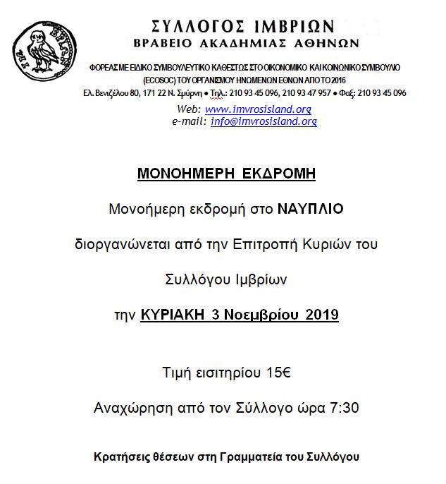 Μονοήμερη εκδρομή Επιτροπής Κυριών Συλλόγου Ιμβρίων στο Ναύπλιο - Κυριακή 3/11/2019