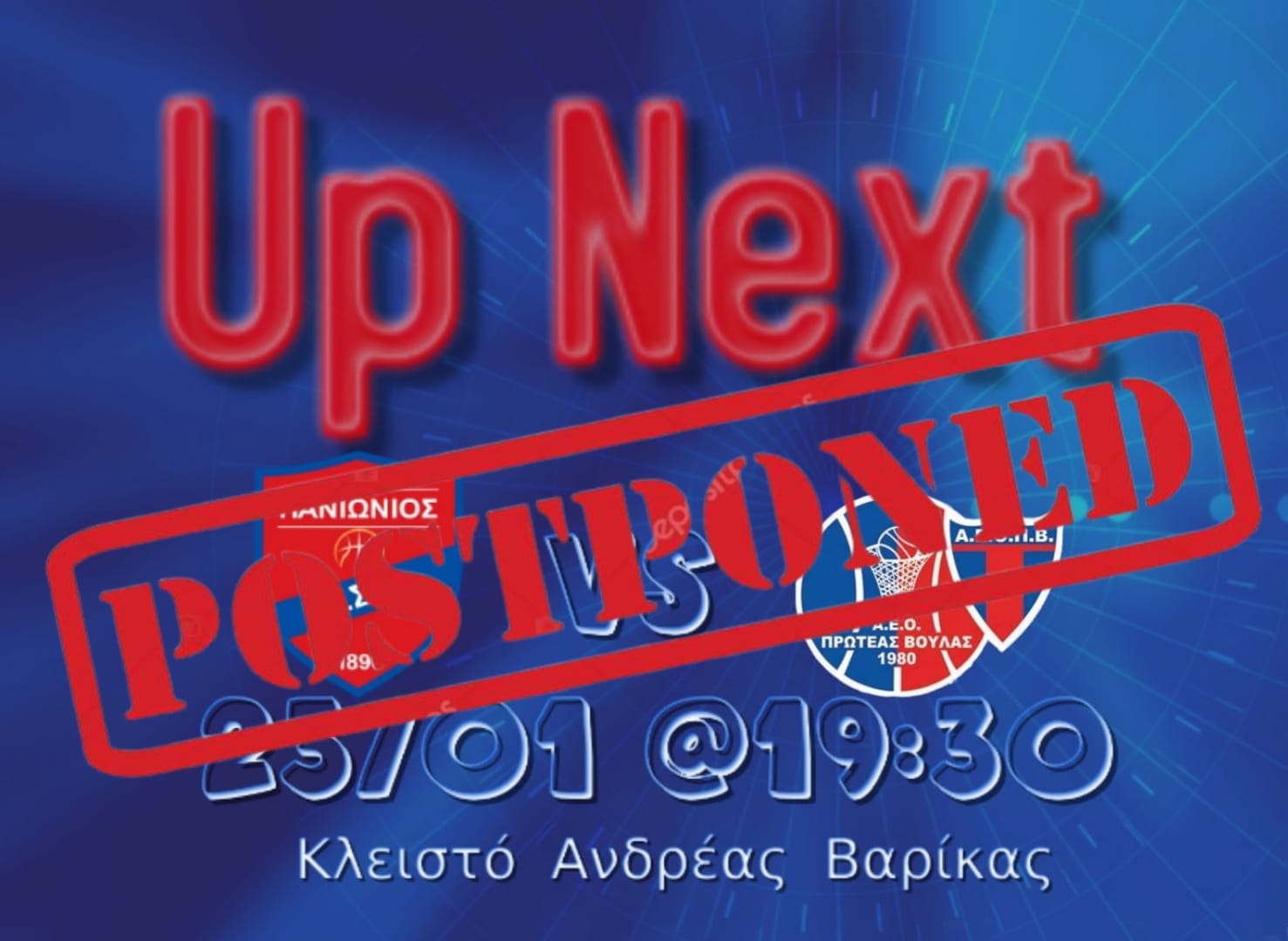 "Σας ενημερώνουμε ότι, λόγω επιβεβαιωμένων κρουσμάτων covid 19 σε αθλητές του σωματείου ΑΕΟ ΠΡΩΤΕΑΣ ΒΟΥΛΑΣ, ο αγώνας ΠΑΝΙΩΝΙΟΣ ΓΣΣ – ΑΕΟ ΠΡΩΤΕΑΣ ΒΟΥΛΑΣ της 23/01 για την 12η αγωνιστική του πρωταθλήματος της Β’ Εθνικής κατηγορίας ανδρών (2ος όμιλος) αναβάλλεται".