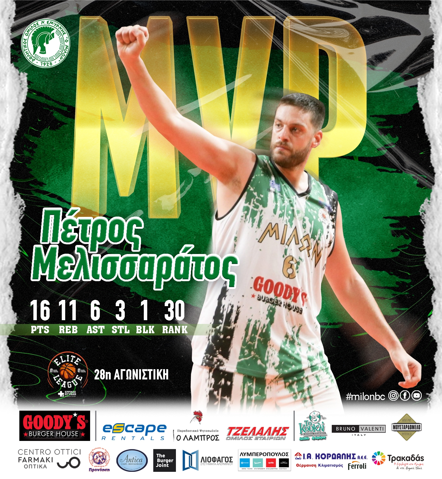 Ο Πέτρος Μελισσαράτος του Μίλωνα ήταν ο πολυτιμότερος παίκτης της 28ης αγωνιστικής στην Elite League Ερρίκος Ντυνάν.